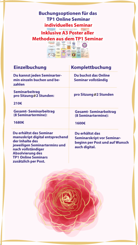 ACHTUNG: Wenn du „TP1 und TP2 individuell“ zusammen komplett buchst, beträgt der Seminarpreis für beide insgesamt nur 2880 Euro. Bei Komplettbuchung von TP1, TP2 und TP3 beträgt der Gesamtseminarbetrag 4000 Euro.